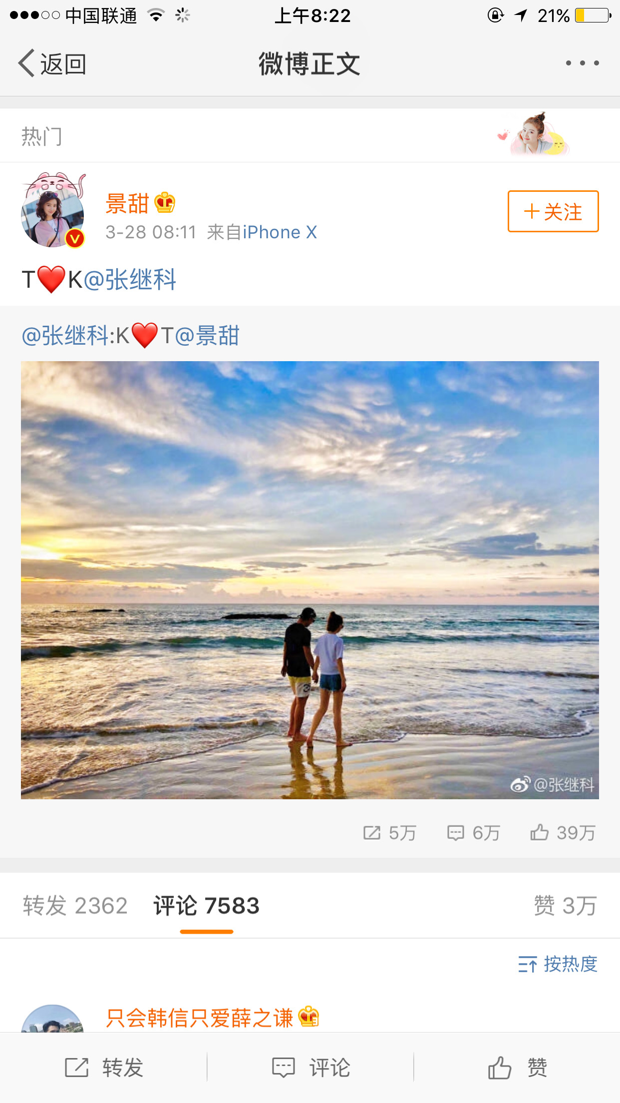 公布时间是7:21,景甜生日~嘤嘤嘤,好甜哟~