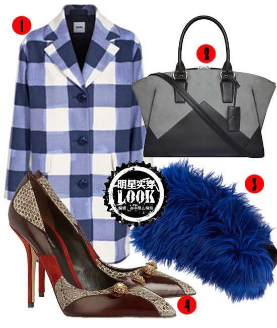 推荐单品: ① MOSCHINO 蓝色格纹大衣 ② Narciso Rodriguez 提包 ③ MARNI 羊毛皮坎肩 ④ DOLCE & GABBANA Bellucci 绒面革、锦蛇皮拼接高跟鞋