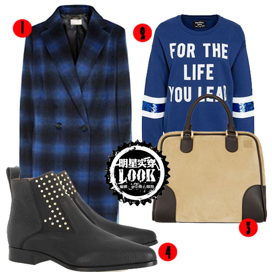 推荐单品: ① Planet 深蓝色格纹大衣 ② Lee Jeans 卫衣 ③ LOEWE Amazona 绒面革和皮革手提包 ④ CHLOé 铆钉纹理皮革及踝靴 丽塔-欧拉(Rita Ora)
