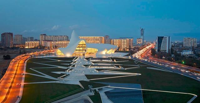 NO.11 盖达尔·阿利耶夫文化中心 阿塞拜疆 由著名建筑师Zaha Hadid设计,建筑使用了12,027块复合面板,创造了一个90千米长的带金属顶梁的表皮——形成了并列复合的三角形、梯形和平行四边形的形式语言。屋顶下方是一个40,000平方米的蜿蜒的空间网络,有一个洞穴式的报告厅和五层的自然光展厅。两个装饰性水池和一座人工湖构成了广场空间,同时还作为公共讨论区,被菱形的绿色景观划分、切割。