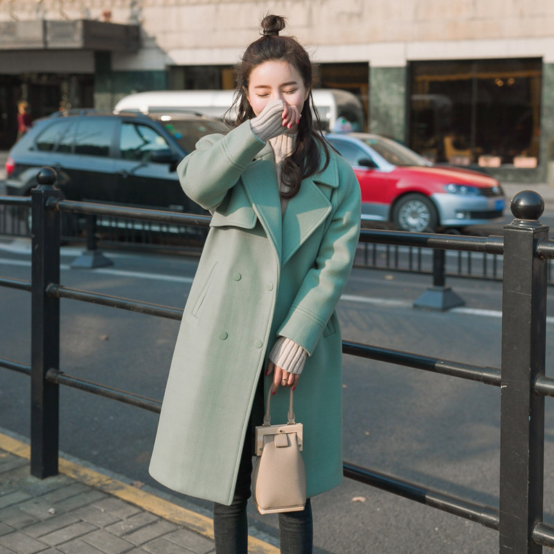 韩国女装大衣女中长款冬装2016新款韩版宽松双排扣休闲毛呢外套潮