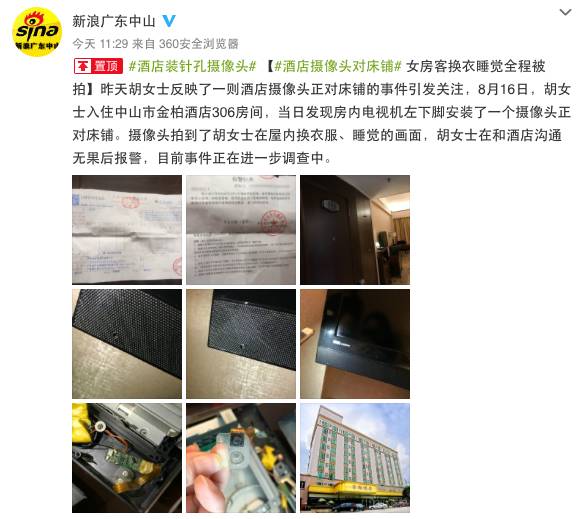 8月16日,胡女士入住中山市金柏酒店306房间。当日入住后,她发现房内电视机左下角安装了一个摄像头正对床铺。